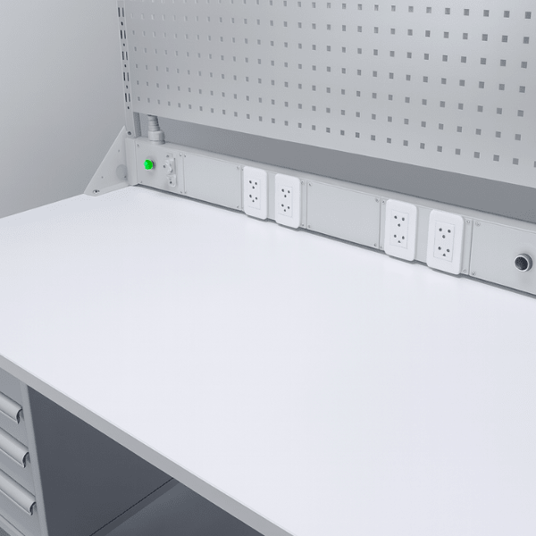 | Trên mặt bàn phía sau là module nguồn điện bao gồm | Công tắc ổ cắm đèn báo nguồn Aptomat |