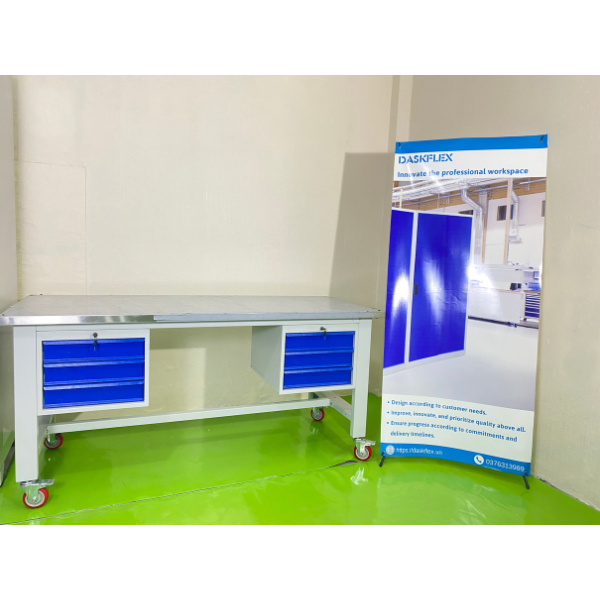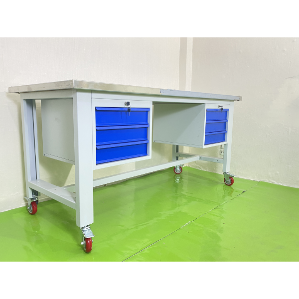 | Bộ bao gồm | 1 khung bàn 2 cụm hộc ngăn kéo treo 6 ngăn kéo 6 tay nắm nhôm 1 mặt bàn gỗ ốp inox 4 bánh xe cọc vít có khóa |