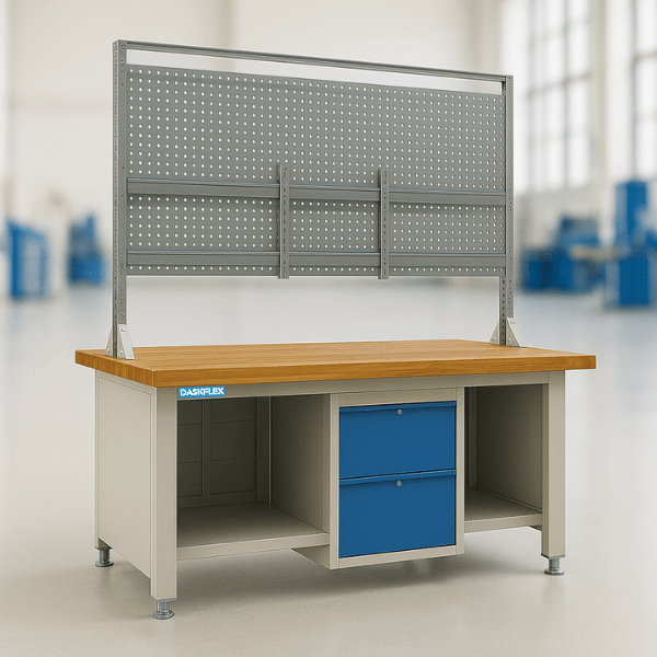 Bàn thao tác Daskflex TPBANT03 có kích thước 2000x800x850/2200mm, được chế tạo từ thép tấm sơn tĩnh điện kết hợp mặt bàn gỗ tre ghép dày 50mm, mang lại độ bền cao và vẻ ngoài hiện đại.