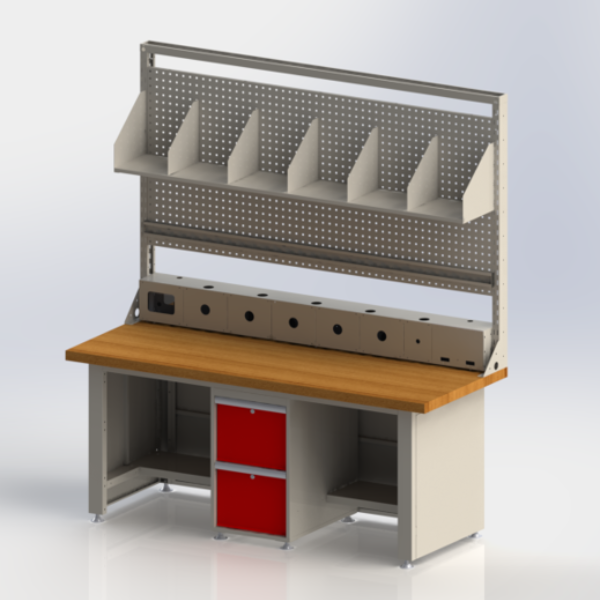 Trên mặt bàn tích hợp cụm panel treo dụng cụ cùng cụm treo file phía trước, giúp tổ chức tài liệu và dụng cụ khoa học. Bàn còn hỗ trợ nhiều tùy chọn mở rộng như cụm treo màn hình, khay nhựa, đèn chiếu sáng…