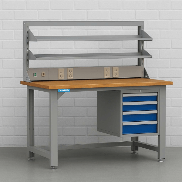 | Thông tin sản phẩm | Mặt bàn làm bằng gỗ cao su dày 30mm Bàn gồm: 1 cụm cấp nguồn, 1 cụm tủ ngăn kéo, 1 bộ giá để đồ Cụm cấp nguồn gồm : 1 đèn báo, 1 Aptomat chống giật, 4 ổ cắm đôi 3 chấu Cụm tủ gồm 4 ngăn kéo với kích thước W480x400xH60/80/100/120mm Cụm giá để đồ gồm 2 tấm giá dạng gài Tải trọng 40kg/ 1 tầng |