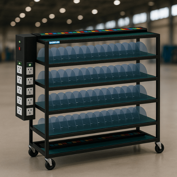 | Khung xe | Làm bằng thép hộp 40x40x1.5mm Các tấm đợt làm bằng thép tấm Toàn bộ được sơn tĩnh điện màu đen RAL9005 Trên tầng đợt được dán thảm cao su chống tĩnh điện, có lỗ khoét D30 để luồn dây điện Một tầng được chia thành 22 ô có chiều rộng 70mm bằng tấm mica Kích thước tấm mica 600x220x3mm |