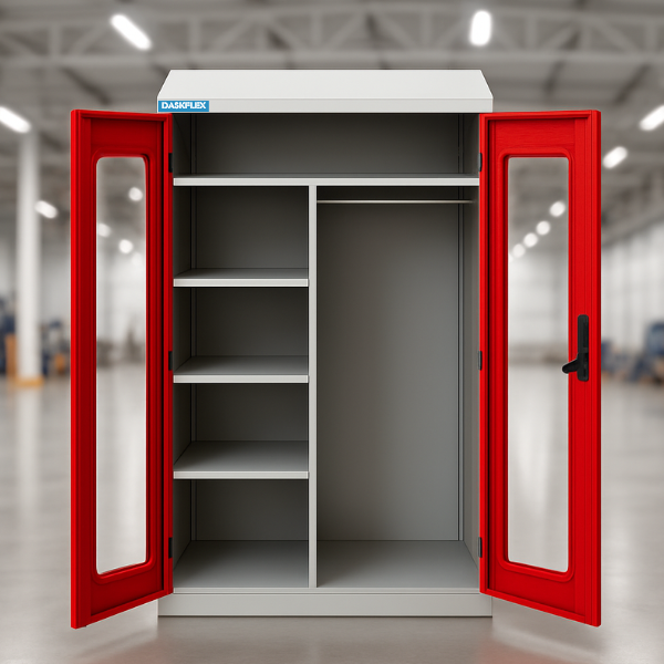 | Thông tin sản phẩm | Gồm 2 khoang lớn và 4 khoang nhỏ Toàn bộ tủ được sơn tĩnh điện Bên trong tủ chia làm 6 khoang chứa đồ Trong khoang có thanh treo quần áo bảo hộ/ PCCC Cánh tủ dạng mở, trên cánh tủ ốp tấm mica trong suốt |