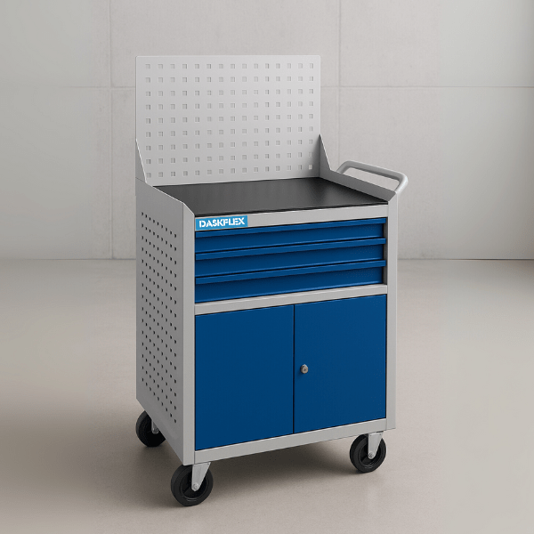 | Thông tin sản phẩm | Có khóa chung cho 3 ngăn kéo Hộc tủ dạng cánh mở, có khóa cho hộc tủ Phía trên trang bị bảng Panel treo dụng cụ kích thước 628x333mm Bề mặt có trang bị thảm xốp chống trước Tủ trang bị 4 bánh xe: 2 bánh xoay khóa, 2 bánh cố định |