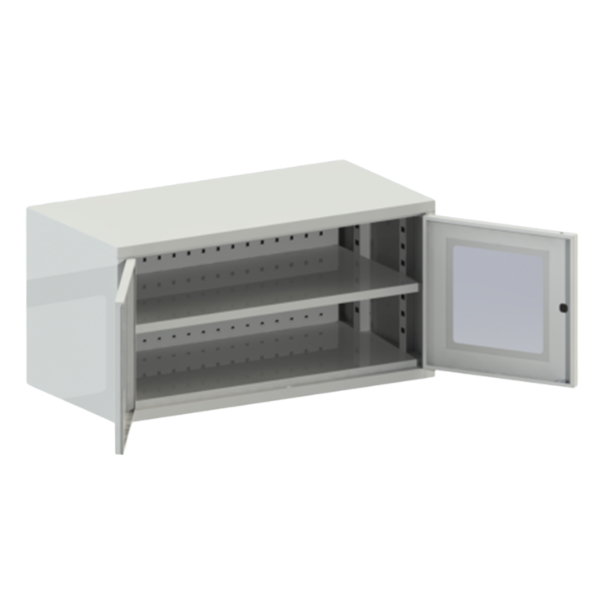 Tủ Lockout 2 cánh mở 800x400x400mm bằng thép sơn tĩnh điện, có mica, đợt để đồ và panel treo dụng cụ. Tải trọng treo tường 80kg, phù hợp nhà máy, xưởng.