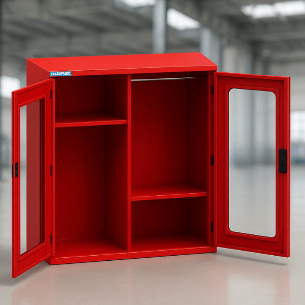 | Thông tin sản phẩm | Toàn bộ sơn tĩnh điện màu đỏ E1349 Bên trong tủ được chia làm 4 khoang, có thanh treo đồ Có thể dễ dàng tháo lắp hoặc thay đổi chiều cao giữa các khoang Tải trọng 1 tầng 50kg Cánh tủ dạng xoay ốp tấm mica |